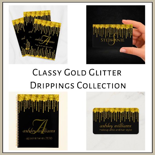Een monogrammed initiaal / naam, goud en zwart stijlvol notitieboek afsprakenboek voor haar- en make-upstylisten - met luxueuze gouden glitterdruppels en een chique metallic gouden achtergrond op de rug.