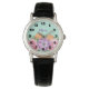 Pas dit elegante horloge met een naam in een paarse klassendoopvont aan. Een prachtige boeket van waterverf bloesems met roze pinda's, paarse anemonen en oranje tulpen omgeven door groene bladeren. Plaats op een zachte munt groene waterverf textuur.