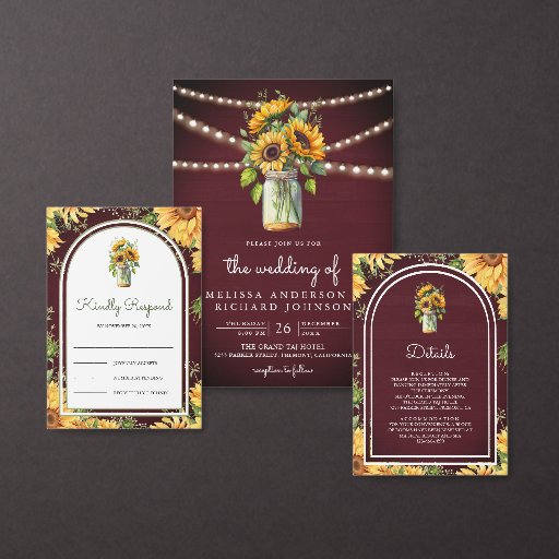 Bourgogne zonnebloemen Mason Jar QR Code Weddensch Drieluik Uitnodiging