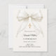 Celebrate your daughter's milestone with this elegant Confirmation invitation. This design features a stunning, oversized ivory silk bow adorned with delicate pearl strands and a central ornate gold cross. It is the perfect choice for a traditional Catholic ceremony or a sophisticated religious celebration for a young girl.
