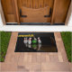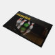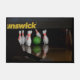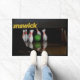 Een deurmat met een foto van een bowlingbal die bowlingspelden omver slaat.