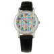 Dit dameshorloge heeft een modern ontwerp uit het midden van de eeuw van afgeronde rechthoeken, waarvan sommige zijn bevestigd en sommige hebben steruitbarstingen, in retro kleuren van rood, goud, groen en turquoise. Als je het ontwerp leuk vindt, maar liever verschillende kleuren hebt, stuur me dan een bericht.