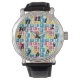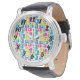 Dit mannen horloge heeft een modern ontwerp uit het midden van de eeuw van afgeronde rechthoeken, waarvan sommige zijn bevestigd en sommige hebben steruitbarstingen, in retro kleuren van rood, goud, groen en turquoise. Als je het ontwerp leuk vindt, maar liever verschillende kleuren hebt, stuur me dan een bericht.