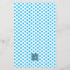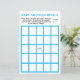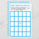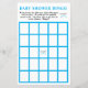 Het ontwerp bevat de kop "Baby shower Bingo" in helderblauw. aanwijzingen worden hieronder in zwarte tekst weergegeven zodat u deze gemakkelijk kunt lezen. Afbeelding van een regenwolk die blauwe regen doucht, staat rechts en in het midden afgebeeld. (vrije ruimte) Omgekeerde heeft een blauwe en witte polka-dot achtergrond.