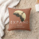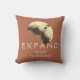 "Breid je horizon uit" is vaak de beste cursus om los te komen en vooruit te gaan. Het kan ook leiden tot de ontdekking van prachtige mogelijkheden en kansen in je leven en jezelf. Aan de ene kant van het kussen is deze bemoedigende, inspirerend boodschap te zien in lichte letters op een roestkleurige oranje achtergrond voor een sepia-achtig abstract ontwerp in donkerbruin, bleek geel en bruin. Aan de andere kant, het ontwerp zonder woorden, ook op een roest oranje achtergrond.