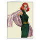 Artiest: Coby Whitmore | Roodharige vrouw in een groene jurk die een roze scheer uitlaat.