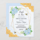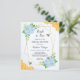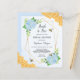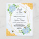 Deze bruiddoucheuitnodigingen zijn voorzien van een waterverf florale vormgeving met blauwe brandkranen, bladeren, honingbijen, honingraat en een faux goud geometrisch lijst. Er zijn ook overeenkomende producten beschikbaar.