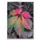 Een briljant gekleurd herfst blad in de schoppen van magenta, rood, oranje, geel, goud en groen staat opvallend op tegen een achtergrond van grijs en bruin herfstpuin en gras.