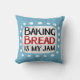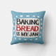 "Baking Bread Is My Jam" is een schattig tekstontwerp in blauw met zwarte en rode tekst, samen met een witte accentvorm en witte gestructureerde grillige stippen eromheen.
