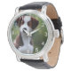 De foto is een bruine en witte puppy aan de rand genaamd Bruce.