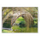 Een brug met boomtakken die er overheen hangen en een meer onder de brug.