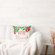 De achterkant van het kussen heeft een rode achtergrond en een witte tekst.