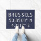 De coördinaten van de breedte- en lengtekaart van Brussel België in het stedelijke, grijze lettertype op donkerblauwe achtergrond