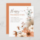 Florals Happy Thanksgiving-kaart. Een SMALLER 4,5 x 5,6 inch budget in een SEMI-GLOSS 110 lb KAART STOCK, vergelijkbaar met de dikte van een briefkaart. De enveloppen zijn lichtjes groter dan de kaartgrootte. Ik wens uw vrienden en familie Happy Thanksgiving met dit ontwerp van sumptueuze herfst-bloemen en -bladeren in tinten van oranje en bruin ter decoratie van de rechterkant en de typografie aan de linkerkant met uw groet en namen.