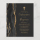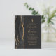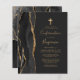 De linkerrand van deze elegante moderne bevestigingsuitnodiging is voorzien van een zwarte waterverf aan de rand van de afgrond, die met faux goudglitter is bedekt. Een kruis van de faux gouden folie verschijnt boven de klantgerichte tekst, die goudkleurige handschrift, copperplate en cursieve doopvonten op een leisteenzwarte achtergrond combineert. De achterzijde is voorzien van een bijpassend zwart en goudvormig ontwerp.