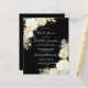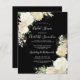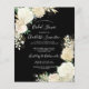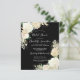 Zeer witte en blauwe rozen worden in gouden en groene bladeren genaaid. Ze omringen je vrijgezellenfeest details in witte tekst. De zwarte achtergrond maakt ze echt pop!