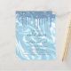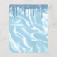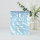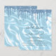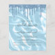 Een chique, modern design met een bleke blauw zijde of satijnen achtergrond met een bovenrand van blauw glitter druppelt. De woorden "vrijgezellenfeest" en de naam van de aanstaande bruid verschijnen in kleine letters kalligrafie script met decoratieve swashes aan het begin en het einde, met de resterende tekst in sans serif lettertype. De blauwe satijnen achtergrond en de glitter drip rand worden herhaald op de keerzijde. (Vervang alleen de letters van de naam van de aanstaande bruid om de swashes te behouden, waarbij de symbolen op hun plaats blijven.)