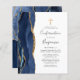 De linkerrand van deze elegante moderne bevestigingsuitnodiging is voorzien van een blauw-marinekliergrens aan de waterverf, die met faux goudglitter is getrimd. Een kruis van de faux gouden folie verschijnt boven de klantgerichte tekst, die manuscript, copperplate en cursieve doopvonten in houtskool grijs op een witte achtergrond combineert. De achterzijde is voorzien van een bijpassend blauw en goudvormig ontwerp.