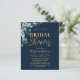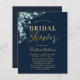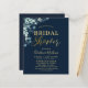Elegant Bridal Shower-uitnodiging. Met roestbloeiende bladeren en kleine blauwe bloemen op een blauw marineklein met faux gouden moderne kalligrafie. Gemakkelijk om uw te creëer met het verpersoonlijkingshulpmiddel.