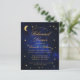 Een budget repetitie diner uitnodiging voor een hemelse bruiloft thema, met de maan en ster op een sterrennacht blauwe achtergrond. De titel Repetisal Dinner en de namen zijn geschreven in een elegant kalligrafisch script. De maan en de sterren zijn faux gold folie, de tekst is goudkleurig. Op de zwarte, is er alleen de maan en ster op een sterrenblauwe achtergrond. De sterrennachtfoto is gemaakt door Felix Mittermeier van Pixabay en is gratis voor commercieel gebruik.