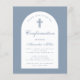 Een moderne bevestigingsuitnodiging voor een jongen. Op een stoffige blauwe achtergrond heeft het een witte boog met stoffige blauwe tekst binnenin. De gelegenheid en de naam worden geschreven in een elegant kalligrafisch manuscript; de eerste lijn is arched tekst.