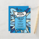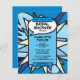 Een leuke, koele en trendy stripboek-geïnspireerde uitnodiging voor een bruiloftsfeest op budget die de wham, zap, pow toevoegt aan elk feest van een superheldbruid-to-be. De achterkant heeft een passend blauw polka stippenpatroon. Ontworpen door Thisisnotme©