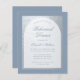 Een moderne uitnodiging voor een repetitief diner. Op een stoffige blauwe rechthoekige achtergrond, heeft het een faux zilverfolie die binnen stoffige blauwe tekst op witte achtergrond heeft. De woorden Rehearsal Dinner en de namen worden geschreven in een elegant kalligrafisch manuscript; de eerste lijn is arched tekst.