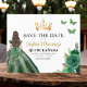 Kondig uw speciale dag aan met een betoverende Emerald Green Princess Quinceañera Save the Date-uitnodiging. Met een vorstelijk smaragdgroen kleurenpalet en elegante details zet deze uitnodiging de toon voor een koninklijk feest. Versierd met delicate accenten geschikt voor een prinses, het perfect vangt de magie van uw aanstaande quinceañera. Dit tijdloze ontwerp nodigt gasten uit om hun kalenders te markeren en zich voor te bereiden op een onvergetelijke dag vol schoonheid, vreugde en gekoesterde herinneringen terwijl u uw 15e verjaardag in stijl viert.