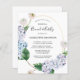 Blauwe hydrangebloemen en bloemen met blozen rozen versieren een gouden ovale lijst. Een open en airy modern botanisch.
