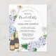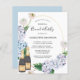 Blauwe hydrangebloemen en bloemen met blozen rozen versieren een gouden ovale lijst. Een open en airy modern botanisch.