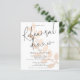 Een budgetprijs voor KLEINE 4,5 x 5,6 inch. Verkrijgbaar in een SEMI-GLOSS 110 lb KAART STOCK dat de standaardoptie is (dikker voor uitnodigingen), OF een SATIN FINISH 80 lb THINER PAPER STOCK (ideaal voor behuizingen). De enveloppen zijn een facultatieve extra en zijn lichtjes groter dan de kaartgrootte. Dit moderne ontwerp heeft elegant informeel vastgesteld manuscript voor repetitie Dinner en perzikkleurige bladeren die op de achtergrond worden gekleurd. De rest van de typografie kunt u gemakkelijk personaliseren. U kunt tekst en achtergrondkleuren aan beide zijden ook wijzigen als u dit wenst via de optie Verdere aanpassing.
