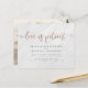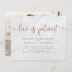 Yikes! Onvoorziene omstandigheden zijn moeilijk te plannen, maar met deze huwelijksuitstel kaarten kun je je geliefden gemakkelijk laten weten! Met een witte marmerachtergrond. De woorden "liefde is geduldig" staan bovenaan in een faux roos gouden folie kalligrafie met zoete zeugen. Als onderdeel van de begrotingsselectie hier op Zazzle, komen deze uitnodigingen niet met enveloppen en passen ze ook niet goed in een standaard envelop. De dichtstbijzijnde grootte is A6, maar er zal een gat van ongeveer een halve inch zijn. Als u het gebrek aan snugheid niet erg vindt, kunt u zulke breed beschikbare A6-enveloppen gebruiken. Anders, kan dit ontwerp naar een standaard 5x7 formaat (dat met enveloppen komt) worden overgebracht gebruikend het hulpmiddel van de ontwerpoverdracht. Als ruwe gids, vanaf het ogenblik van het schrijven, zouden 100 begrotingsuitnodigingen (met inbegrip van een volumekorting) rond $39 kosten terwijl 100 standaard 5x7 uitnodigingen met inbegrip van enveloppen ongeveer $135 zouden kosten. Uw kilometerstand kan variëren afhankelijk van de promotiecodes van Zazzle, de verkoop ter plaatse of prijswijzigingen.