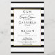 Met een klassieke zwart-wit gestreepte achtergrond heeft deze elegante budget bruiloft koppel feest uitnodiging een nep goud folie rand die de details van het koppel feest omlijst in moderne chic typografie en een speciale foto aan de achterkant. Ontworpen door Thisisnotme