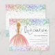 Multicolor Glitter Gown Blond Quinceanera Invitation. Een budgetprijs voor KLEINE 4,5 x 5,6 inch. Verkrijgbaar in een SEMI GLOSS 110 lb KAART STOCK dat de standaardoptie is (dikker voor uitnodigingen), OF een SATIN FINISH 80 lb THINER PAPER STOCK (ideaal voor behuizingen). De enveloppen zijn een facultatieve extra en zijn lichtjes groter dan de kaartgrootte. Een beetje elegantie voor je Quinceanera met een afbeelding van het achterste uitzicht van een meisje met blond gelaagd haar in een prachtige roze kogeljurk en een regenboogkleurige glitter die aan beide zijden de boven- en onderkant van de zijkant bedekt. De belangrijkste kopbal is in een geplaatst handschrijvend stijlmanuscript en personaliseert gemakkelijk de rest van de tekst aan uw details.