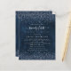 Budget Navy Blue Glitter Girly 21st Party. Een budgetprijs voor KLEINE 4,5 x 5,6 inch. Verkrijgbaar in een SEMI GLOSS 110 lb KAART STOCK dat de standaardoptie is (aanbevolen voor uitnodigingen, vergelijkbaar met de dikte van een briefkaart) OF een SATIN FINISH 80 lb THINER PAPER STOCK (ideaal voor behuizingen). Een grens van blauw glitter van de marine is bij de bovenkant aan elke kant op een ruwe marine achtergrond, en Twintig eerst is in een handschrijvend stijlmanuscript. Pas de tekst eenvoudig aan uw eigen details aan.