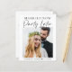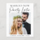 Een budgetvriendelijke moderne huwelijksontwikkeling of een kleinere trouwaankondiging om familie en vrienden te laten weten dat de omstandigheden je ertoe noopten het aantal gasten op je bruiloft te verminderen, maar dat je in de toekomst een feestelijke receptie zult organiseren. De voorzijde kenmerkt uw foto en "Gehuwd nu, Partij later"in een mengeling van eenvoudige typografie en een manuscript van de chroiek. Voeg je voornamen en trouwdatum toe. Voor het omgekeerde, personaliseer uw bericht meer in detail en uw namen in een handtekening-als manuscript.