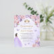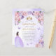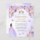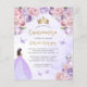 Deze mooie quinceañera-uitnodiging heeft een rand van lila paarse en blush roze rozen op een paarse waterverf achtergrond. Een gouden tiara, een brunette meisje in een paarse prinsessenjurk en kleine paarse vlinders versieren de tekst. Het woord "Quinceañera" en de naam van de eregast verschijnen in elegant goudkleurig handschrift, met de resterende tekst in grijs sans serif lettertype. Voeg extra tekst op de achterkant toe, samen met een QR-code om uw gasten te helpen uw quinceañera-website en RSVP online te bezoeken.
