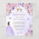 Deze mooie quinceañera-uitnodiging heeft een rand van lila paarse en blush roze rozen op een paarse waterverf achtergrond. Een gouden tiara, een brunette meisje in een paarse prinsessenjurk en kleine paarse vlinders versieren de tekst. Het woord "Quinceañera" en de naam van de eregast verschijnen in een elegant paarse handschrift, met de resterende tekst in grijs sans serif lettertype. Voeg extra tekst op de achterkant toe, samen met een QR-code om uw gasten te helpen uw quinceañera-website en RSVP online te bezoeken.