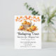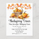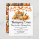 Een Schattigee Thanksgiving met een mandje vol pompoenen en kleurrijke herfstbladeren aan de ene kant en herfstplaids met bladeren en pompoenen aan de andere kant. U kunt deze uitnodiging personaliseren met uw dinerdetails.