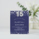 Een moderne, stijlvolle en glamoureuze uitnodiging voor een 15de verjaardag van Quinceañera. Een blauwe achtergrond voor de marine, versierd met faux zilveren sterren. Personaliseer en voeg jouw naam en partijdetails toe. Nummer 15 wordt geschreven met een ballonstijllettertype.