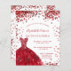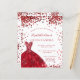Een moderne, stijlvolle en glamoureuze uitnodiging voor een 15de verjaardag van Quinceañera. Een witte achtergrond met sparkles, een rode jurk. De naam wordt geschreven met een modern handgeschreven stijlmanuscript met letters. Pas je partijgegevens aan en voeg deze toe.