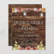 Budget Rustic Country Outdoorin on Dark Wood with Burgundy, Oranje and Yellow Sunflower with Mason Jars on String Light Autumn of Herfst Quinceanera Celebration Party Invitations - bevat prachtige en elegante scripttypografie voor de speciale verjaardagscypografie.