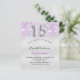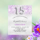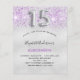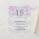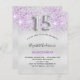 Een moderne, stijlvolle en glamoureuze uitnodiging voor het 15e verjaardagsfeest van een meisje. Een faux zilveren metalen achtergrond met een elegante paarse faux glitter-druppels, vlekken. De naam wordt geschreven met een modern handgeschreven stijlmanuscript met letters. Pas je partijgegevens aan en voeg deze toe. Nummer 15 wordt geschreven met een ballonstijllettertype, script.