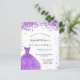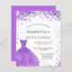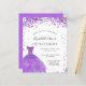 Een moderne, stijlvolle en glamoureuze uitnodiging voor een 15de verjaardag van Quinceañera. Aan de voorkant: Een witte achtergrond met violette, lila enkels, een violette jurk. De naam wordt geschreven met een modern handgeschreven stijlmanuscript met letters. Pas je partijgegevens aan en voeg deze toe.