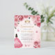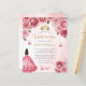 Deze mooie quinceañera-uitnodiging heeft een rand van roze rozen op een roze waterverf-achtergrond. Een gouden tiara, een brunette meisje in een roze prinsessenjurk en kleine roze vlinders versieren de tekst. Het woord "Quinceañera" en de naam van de eregast verschijnen in elegant goudkleurig handschrift, met de resterende tekst in grijs sans serif lettertype.