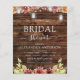 Budget Rustic Landelijk Buiten op Donker Hout met Burgundy, Oranje en Gele Zonnebloemen met Metselaars Potten op Slinger Licht Herfst of Val Bruiloft Bruidsfeest Uitnodigingen - inclusief mooie en elegante script lettertype voor de speciale Bruid om te Vieren viering.