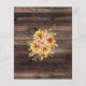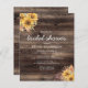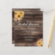 Deze rustieke uitnodiging voor een bruidsdouche bevat gele aquarel zonnebloem boeketten op een bruine schuur hout achtergrond, met de woorden "bruidsdouche" in een casual handgeschreven lettertype. Pas de rest van de tekst aan met de naam van de aanstaande bruid, de locatie van de douche en andere details. De achterkant bevat een groot zonnebloem boeket op dezelfde houten achtergrond.