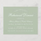 Een eenvoudige, minimalistische uitnodiging voor een repetitief diner: alleen witte tekst op een groene achtergrond. De woorden "Dinner van de repetitie"en de namen worden geschreven in een elegant kalligrafisch manuscript, de rest in petten.