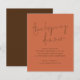 Eenvoudige Thanksgiving die Terracotta uitnodigt. Een budgetprijs voor KLEINE 4,5 x 5,6 inch. Verkrijgbaar in een SEMI GLOSS 110 lb KAART STOCK dat de standaardoptie is (aanbevolen voor uitnodigingen), OF een SATIN FINISH 80 lb THINER PAPER STOCK (ideaal voor behuizingen). De enveloppen zijn facultatief en zijn lichtjes groter dan de kaartgrootte. Minimalistische stijl met trendy handschriftenstijl die typografie in bruin voor Thanksgiving Dinner plaatst. Pas de rest van de tekst eenvoudig aan met de details van uw gebeurtenis. Getoond in terracotta en bruin maar kan om het even welke kleuren van uw keus zijn. Klik verder aanpassen om het even welke veranderingen aan te brengen.