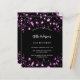 Een zwarte achtergrond versierd met roze sterren. Personaliseer en voeg een naam en feestdetails toe. De naam is geschreven met een handgemerkt stylescript, witte gekleurde letters.